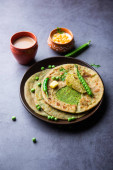 Parathas groszek zielony lub flatbread lub matar parathas z twarogu i gorącej herbaty