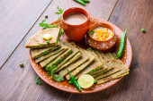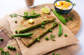 Parathas groszek zielony lub flatbread lub matar parathas z twarogu i gorącej herbaty