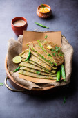 Parathas groszek zielony lub flatbread lub matar parathas z twarogu i gorącej herbaty