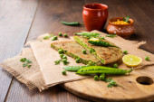 Parathas groszek zielony lub flatbread lub matar parathas z twarogu i gorącej herbaty