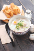 Żart lub Congee w tajlandzkim stylu filiżanka Służył na czarnym drewnianym stole. To azjatyckie śniadanie..