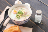 Żart lub Congee w tajlandzkim stylu filiżanka Służył na czarnym drewnianym stole. To azjatyckie śniadanie..