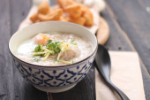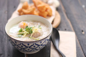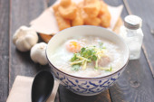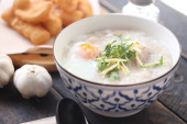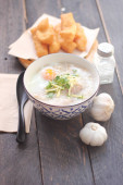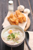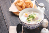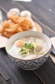 Congee w tajskim wzorem filiżanki i smażone ciasto są tajskie jedzenie i jedzenie ulicy popularne do jedzenia w godzinach porannych