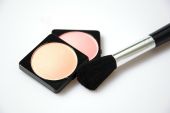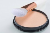 Zamknij obraz makijażu produktów i akcesoriów, paleta konturów, szczotki na białym tle