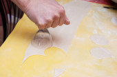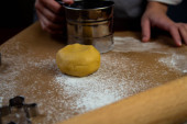 Ciasteczka są wycinane ze zwiniętego ciasta w postaci mężczyzny, cukiernicy trzymają w ręku nóż do ciastek