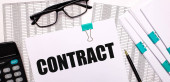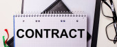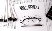 Na pulpicie znajdują się zeszyty, długopis i czerwony folder na dokumenty z tekstem PROCUREMENT Business concept