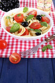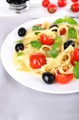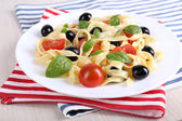 spaghetti z pomidorami, oliwki, oliwy z oliwek i bazylii pozostawia na talerzu tkanina tło