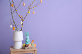 Świąteczne wakacje twórcza dekoracja na drewnianej półce na fioletowym tle z miejsca do kopiowania
