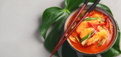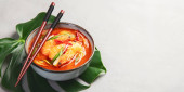 Czerwone curry z kurczakiem w misce na jasnoszarym tle. Tradycyjne azjatyckie jedzenie. Widok z góry, płaski, przestrzeń do kopiowania