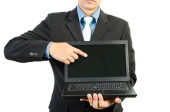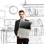 biznesmen z otwartym laptopem w ręce