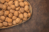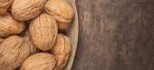 Orzechy włoskie na ciemnym stole vintage. Orzechy włoskie z zielonymi liśćmi. Przestrzeń chroniona.