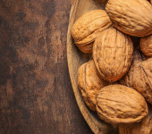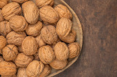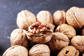 Zdjęcie "Orzechy włoskie na ciemnym stole vintage. Orzechy włoskie z zielonymi liśćmi. Przestrzeń chroniona." może być wykorzystywane do celów osobistych i komercyjnych zgodnie z warunkami zakupionej licencji Royalty-free. Obraz jest dostępny do pobrania w jakości wysokiej rozdzielczości do 5760x3840.