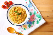 Bulgur z suszonych pomidorów i bazylii na jasnym drewnianym tle. Wegetariańskie danie. Skupienie selektywne.