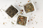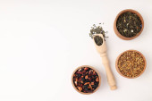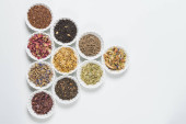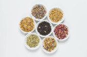Płaska leżała z różnymi rodzajami herbaty na białym tle