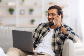 Zdjęcie "Szczęśliwy millenium Afryki męskiej pracy na laptopie i rozmawiać przez telefon w miejscu pracy na kanapie w salonie" może być wykorzystywane do celów osobistych i komercyjnych zgodnie z warunkami zakupionej licencji Royalty-free. Obraz jest dostępny do pobrania w jakości wysokiej rozdzielczości do 5760x3840.