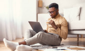 Zdjęcie "Poważny skoncentrowany młody czarny brodaty facet pracuje na laptopie na kanapie we wnętrzu pokoju, spójrz na okno" może być wykorzystywane do celów osobistych i komercyjnych zgodnie z warunkami zakupionej licencji Royalty-free. Obraz jest dostępny do pobrania w jakości wysokiej rozdzielczości do 5760x3840.