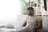 Poważny skoncentrowany młody czarny brodaty facet pracuje na laptopie na kanapie we wnętrzu pokoju, spójrz na okno
