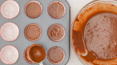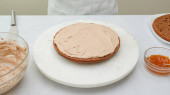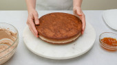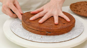Składam ciasto czekoladowe. Kobiece dłonie rozłóż wierzch tortu z dżemem morelowym. Krok po kroku ciasto czekoladowe z receptury krem czekoladowy, zbliżenie procesu pieczenia.
