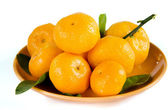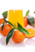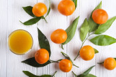 świeży sok pomarańczowy i klementynki z liśćmi wyizolowanymi na białym tle