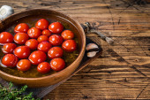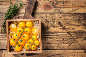 Zdjęcie "Pomidor wiśniowy w plasterkach na drewnianej tacy z ziołami. Białe drewniane tło. Widok z góry" może być wykorzystywane do celów osobistych i komercyjnych zgodnie z warunkami zakupionej licencji Royalty-free. Obraz jest dostępny do pobrania w jakości wysokiej rozdzielczości do 5760x3840.