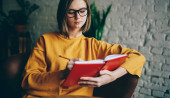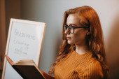 Widok skoncentrowanej uczennicy z notatnikiem stojącej przed uczniami w klasie. Rudowłosa kobieta.