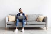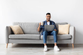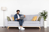 Szczęśliwy młody czarny brodaty mężczyzna czatujący w sieci społecznej, biznesmen praca na laptopie na kanapie