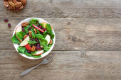 Pyszna sałatka z rzepy serwowana na drewnianym stole, płaska leżanka. Miejsce na tekst