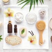 Koncepcja pielęgnacji skóry i spa na białym tle kamienia, zielone liście, sól morska, krem kosmetyczny i szczotka do masażu, kreatywne płaskie leżaki.