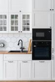 Zdjęcie "Widok z boku nowoczesny czarny piekarnik kuchnia wnętrz. Stylowa biała powierzchnia mebli drewnianych z urządzeniami i wystrojem. Przytulne miejsce do gotowania. Proces pieczenia" może być wykorzystywane do celów osobistych i komercyjnych zgodnie z warunkami zakupionej licencji Royalty-free. Obraz jest dostępny do pobrania w jakości wysokiej rozdzielczości do 5760x3840.