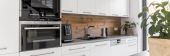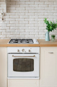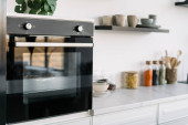 Widok z boku nowoczesny czarny piekarnik kuchnia wnętrz. Stylowa biała powierzchnia mebli drewnianych z urządzeniami i wystrojem. Przytulne miejsce do gotowania. Proces pieczenia