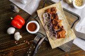 Na ciemnym drewnianym blat, na lnianej serwetce, na desce rozbioru, znajduje się ormiañska lawa, na której jest gotowy szaszłyk z pierścieniami czerwonej cebuli, sos w rondlu, strąk czerwonej papryki, sztućce.