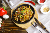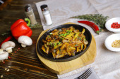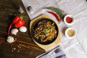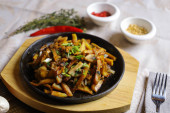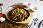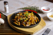 Na patelni, smażone ziemniaki rama kawałki mięsa duszone w sosie, sztućce, czerwona papryka, champignons, sos, ostra papryka, przyprawy, gałąź rozmarynu są na stole. Smażone ziemniaki serwowane są na patelni.