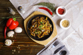 Zdjęcie "Chleb pita podawany jest z grillowaną cukinią warzywną, czerwoną papryką, pomidorem bez skóry na ciemnej desce do krojenia, serwetką lnianą na ciemnym stole. Jest kilka pieprz i sól, sztućce, białe grzyby, cały czerwony pieprz, hot pepper pod, ro" może być wykorzystywane do celów osobistych i komercyjnych zgodnie z warunkami zakupionej licencji Royalty-free. Obraz jest dostępny do pobrania w jakości wysokiej rozdzielczości do 5760x3840.