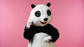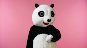 osoba w szczęśliwy panda niedźwiedź kostium stoi odizolowany na różowy