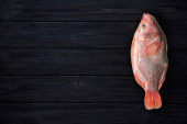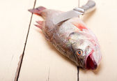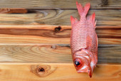 Solony, suszony na słońcu, czerwony mullet z etykietą na ogonie na drewnianym stole