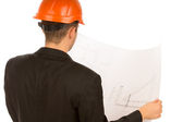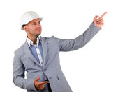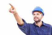 uśmiechający się inżynier wskazując jednocześnie płaszcz na ramieniu