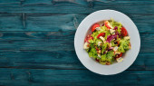 Pyszna sałatka z rzepy serwowana na drewnianym stole, widok z góry. Miejsce na tekst