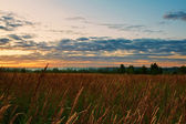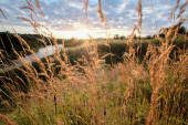 Rano, mgła nad rzeką na polu z pajęczynami na trawie