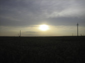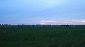 Płaskie pole zasiane płatkami zbożowymi o zachodzie słońca w letni wieczór. W oddali widać niskie drzewa. Chmurne niebo jest zalane ciepłym światłem zachodzącego słońca