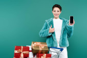 pełny widok długości modnej kobiety ze smartfonem w pobliżu wózka na zakupy z pudełkami na beż
