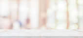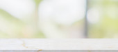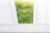 Pusty marmurowy blat stołowy z rozmytym tłem zasłony okna