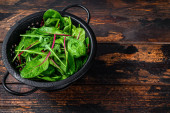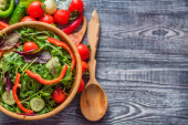 Zdjęcie "Zielona sałatka wegańska z zielonymi liśćmi mix, awokado i warzywa. Drewniane tło. Widok góry. Przestrzeń kopiowania" może być wykorzystywane do celów osobistych i komercyjnych zgodnie z warunkami zakupionej licencji Royalty-free. Obraz jest dostępny do pobrania w jakości wysokiej rozdzielczości do 5760x3840.