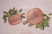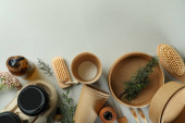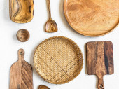 Zestaw naczyń kuchennych na drewnianym stole vintage z góry, drewniane tło