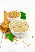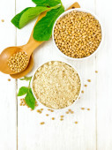 Nasiona kozieradki i mielona przyprawa w dwóch miskach i na stole z zielonymi liśćmi na białym drewnianym tle deski