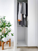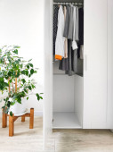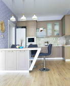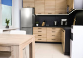 Biała kuchnia skandynawskie wnętrze z okapem kuchennym na drewnianym blat