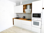 Czarny zlewozmywak z elastycznym kranikiem we wnętrzu kuchni Scandi