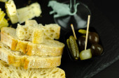 Baguette nadziewana oliwkami, pokrojona świeżymi zielonymi oliwkami i pietruszką, podawana na kamiennym talerzu, zdrowa przystawka