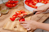 Ręce młodej samicy siekającej świeżą żółtą paprykę
