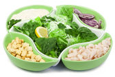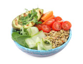 Pyszna miska soczewicy z marchewką, awokado, jajkiem i łososiem na białym tle