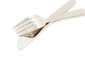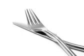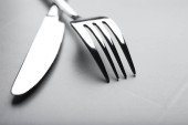 Nowy błyszczący widelec i nóż na białym tle, zbliżenie